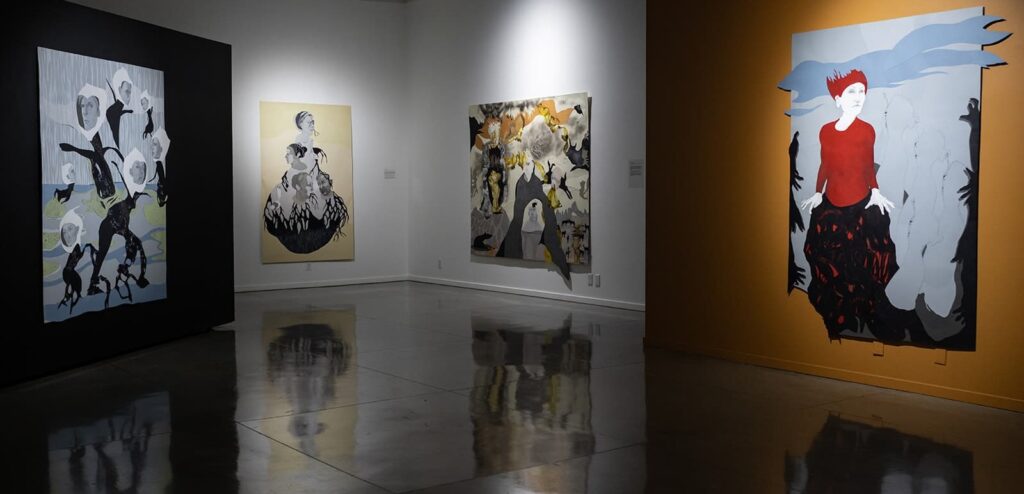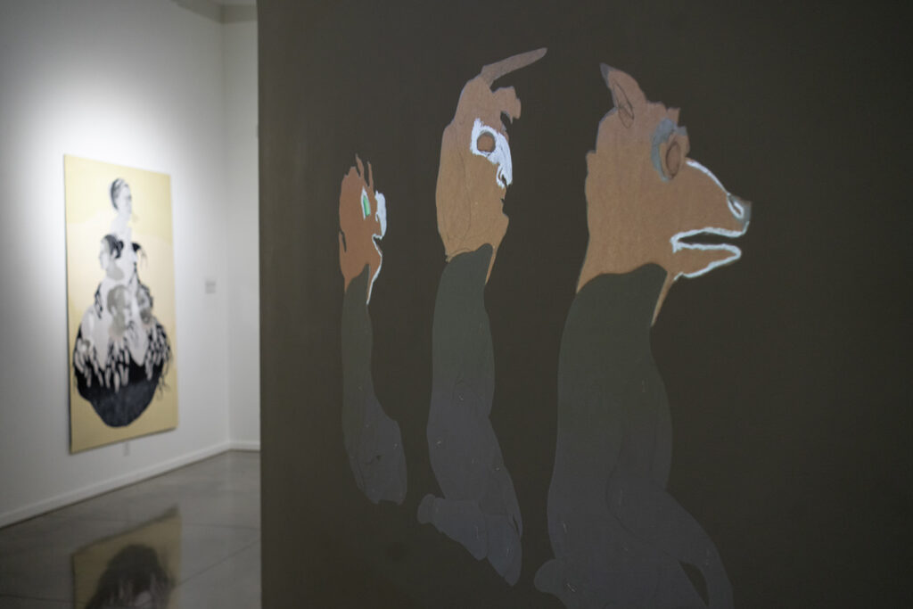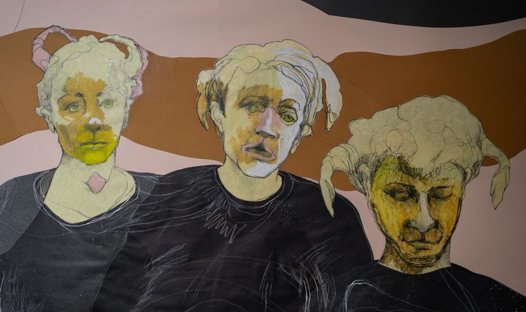 evolving pathways in her practice: expansive cut-paper assemblages and evocative stop-motion animations. Rooted in drawing, her figures emerge from fragments of media imagery—faces that seem to gaze back, awakening narratives of transformation, kinship, and mortality. Through graphite, oil bar, and chalk, each piece grows intuitively, guided by a felt dialogue between material, motion, and memory.