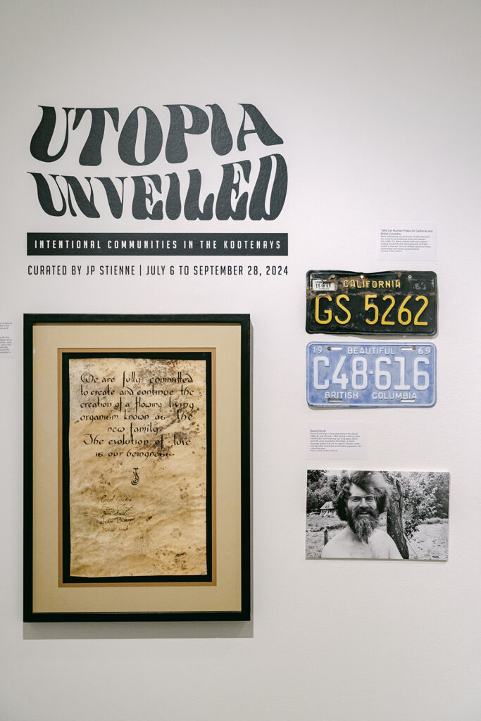 Visitors to Utopia Unveiled will view a traditional Doukhobor spinning wheel, original artifacts from Kootenay communes, counterculture artwork of Robert Inwood, and a communal table with documents related to the story. The display will feature photographs and artifacts related to aspects of the story such as the Vallican Whole Community Centre, Theatre Energy, and a vibrant music scene.